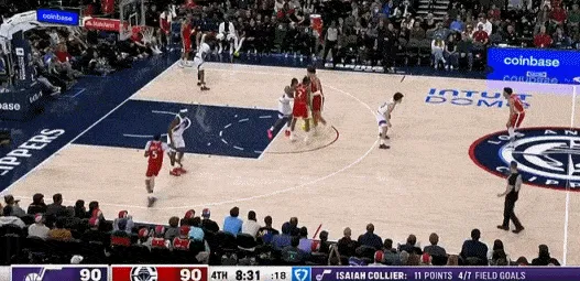 給小卡弧頂傳球后,拉到 45°,接小卡傳球,命中空位三分,也讓爵士不敢輕易包夾小卡,給小卡后面的爆發(fā)打下了基礎(chǔ)。